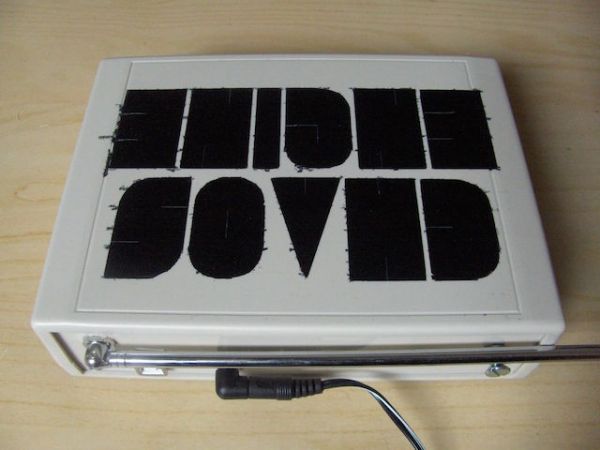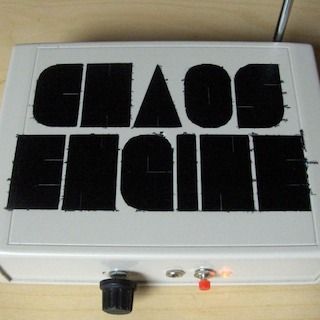 Presented in a plastic enclosure about the size of a medium-sized paperback novel, The Chaos Engine merges a fixed pop song element with a serial-linked FM radio receiver, united by a sequencer which has control over source volume levels and radio tuning parameters. Controls for play/stop and output volume are provided for the listener.